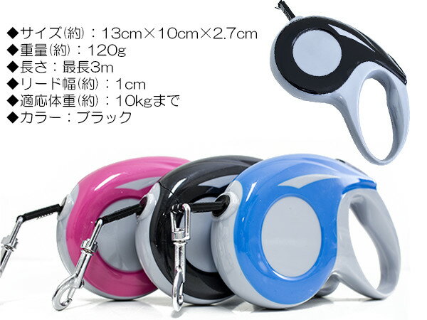 ◆サイズ(約):13cm×10cm×2.7cm◆重量(約):120g◆長さ:最長3m◆リード幅(約):1cm◆適応体重(約):10kgまで◆カラー:ブラック※商品発送日より7日間の初期不良対応。